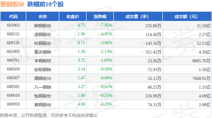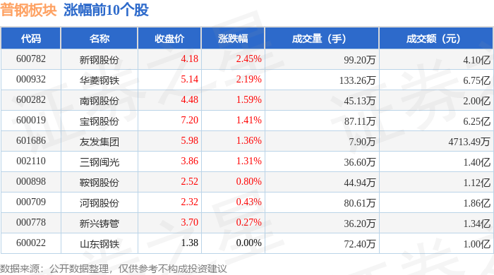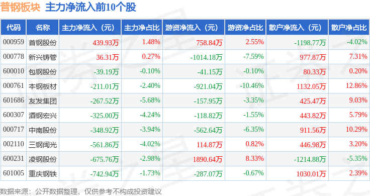 从资金流向上来看,当日普钢板块主力资金净流出6.92亿元,游资资金净流入2.7亿元,散户资金净流入4.22亿元。普钢板块个股资金流向见下表: