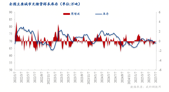 本周钢管市场样本库存焊管增0.31万吨,无缝管降0.06万吨。28个主要城市无缝管样本库存68.73万吨,周环比降0.06万吨,月环比降1.14万吨,年同比降5.31万吨;28个主要城市焊管样本库存82.1万吨,周环比增0.31万吨,月环比增0.46万吨,年同比降2.55万吨。