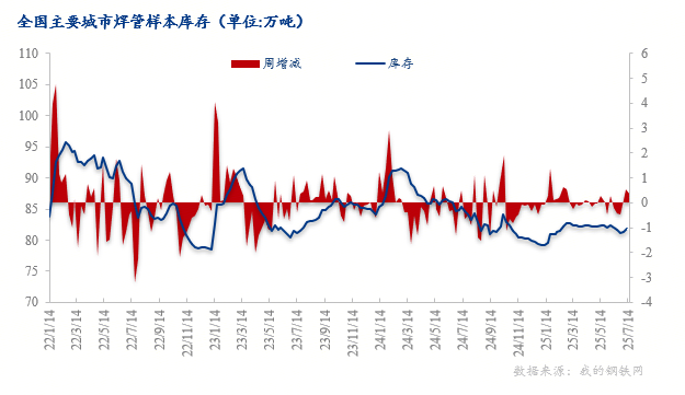 本周钢管市场社库调整不大。本周前半周期钢及市场偏弱震荡为主,后受宏观面消息扰动及部分区域减停产影响,期钢领涨,原料带动管厂价格逐日上调。但高温淡季,市场需求难有起伏,商家高竞争下涨价意愿较低,本周多数地区涨幅明显弱于管厂出厂价。预计下周市场商家仍按需调整库存,变化有限。