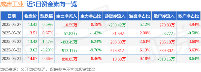 证券之星消息,截至2025年5月27日收盘,威唐工业(300707)报收于13.43元,下跌0.59%,换手率2.96%,成交量4.24万手,成交额5668.66万元。