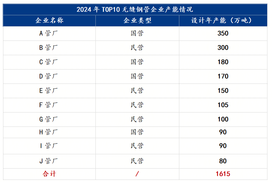 由于无缝钢管品种特殊性及材质、规格多样化导致无缝钢管难以形成类似其他钢材品种的超大型甚至千万吨级别的企业,导致我国无缝钢管产能集中度较低。据Mysteel调研,我国无缝钢管产能TOP10企业来看(国企占4家、民营占6家),产能为1615万吨,占全国产能为38.53%,而这一数据国际超过70%,可以看出相较其他品种,无缝钢管产能集中度仍较低。