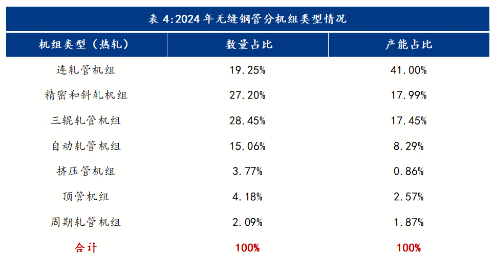 20世纪60年代初,全国共制造安装了34套76mm穿孔机组,早期无缝钢管生产机组主要以自动轧管机组为主,近年来大口径无缝钢管机组尤其是大口径连轧管机组层出不穷,大大增强了国内无缝钢管技术水平。截至2024年统计,连轧管机组数量占比已达到19.25%,产能占比已达到41.00%,成为产能占比最大的机组类型。未来衡阳华菱钢管有限公司还将投资建设目前世界首套最大的连轧管生产机组。一个个标志性的机组建成和生产企业崛起标志着我国无缝钢管技术装备水平“从无到有”、“从有到强”的过程,目前国内无缝钢管生产水平已经基本满足国内生产活动所需。