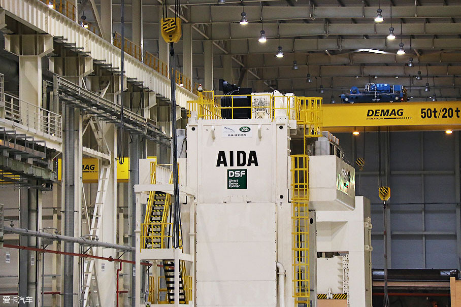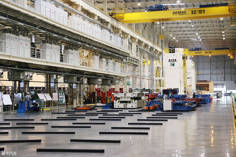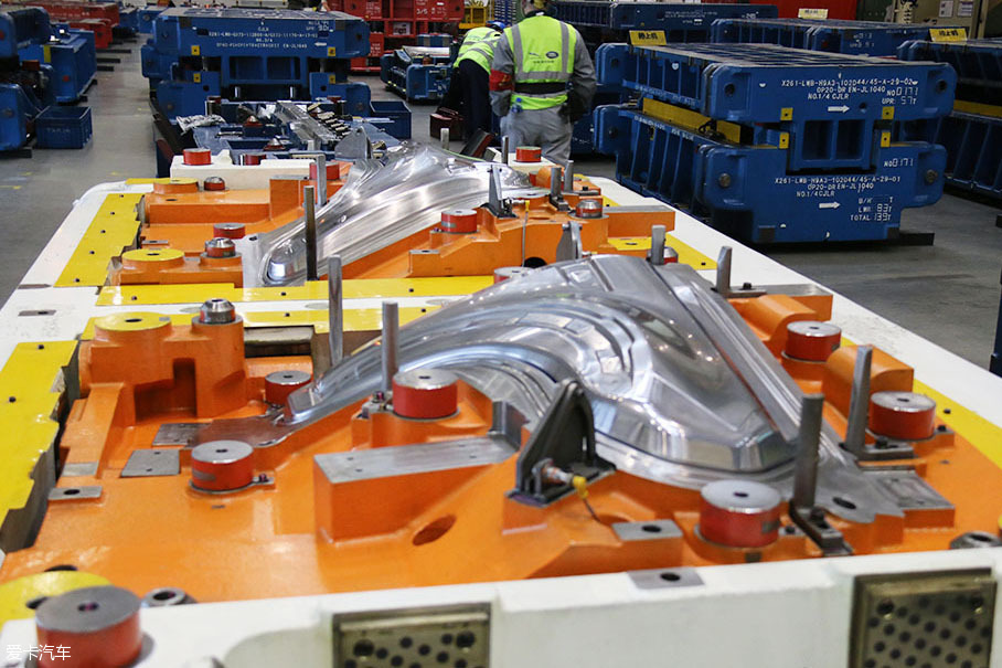 先来看冲压车间。这个车间采用混线生产,车型包括路虎和捷豹。工艺线包括AIDA线、济二线,除此之外还包括模具的储存和维护、修护区域。