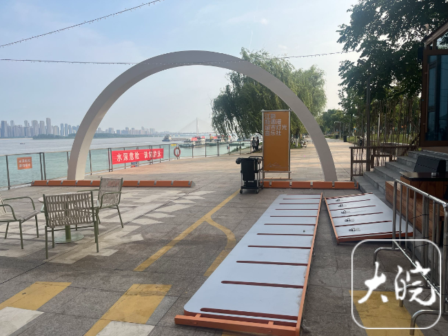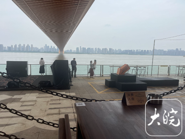 5月28日下午,大皖新闻记者走进杨泗港长江大桥下面江岸边通道的围挡内,里面摆放着多个餐桌、椅子。通道中间观景台区域,还摆放着一架钢琴。