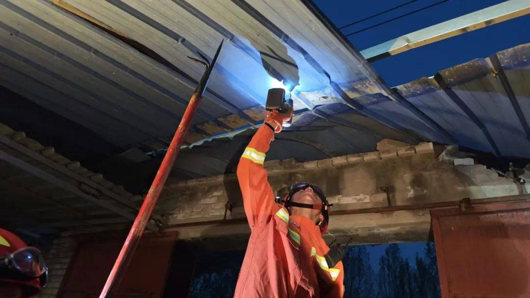 到达现场后,消防救援人员立即对现场进行查看,只见约120平米的棚顶被大风刮落哗哗作响,松动痕迹非常明显。