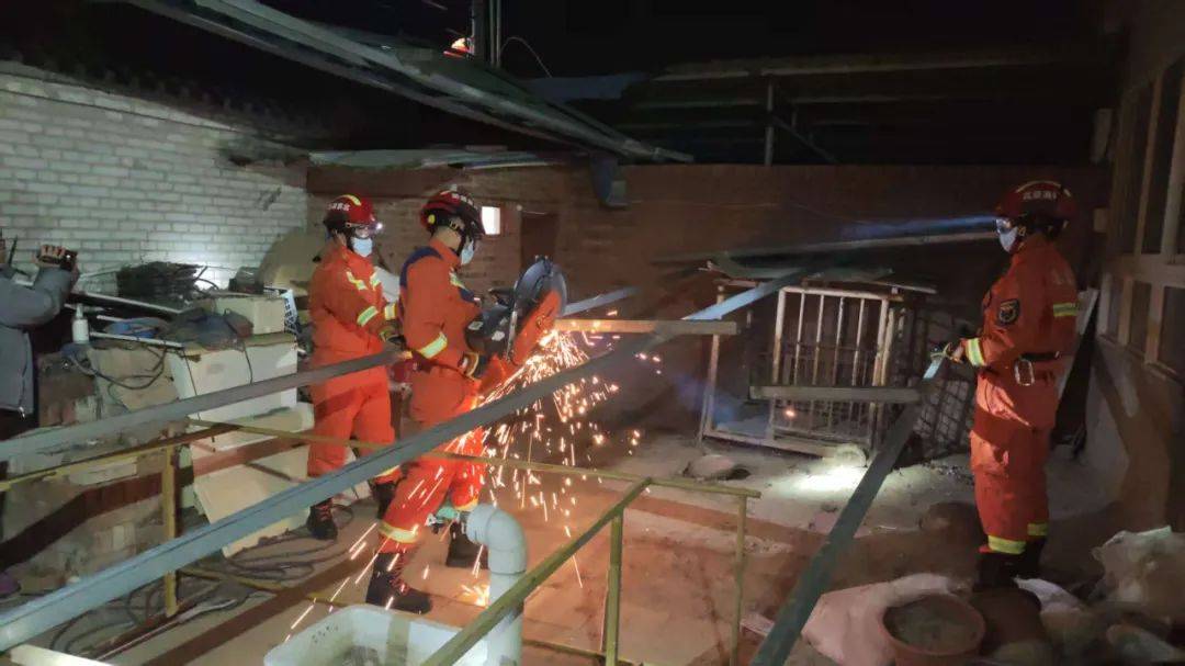 在征求房主意见后,做好断电处理的情况下,消防救援人员做好个人防护分成了2个小组,第一组人员用电动设备将铁皮单板与龙骨之间的连接螺丝逐一进行拆卸,第二组人员扶住顶棚防止晃动,并做好现场安全防范措施。待铁皮单板拆下后,消防员利用切割设备对棚顶的龙骨进行逐一切割。经过近3个小时的紧急处置,最终将棚顶全部处置完毕,排除了险情。
