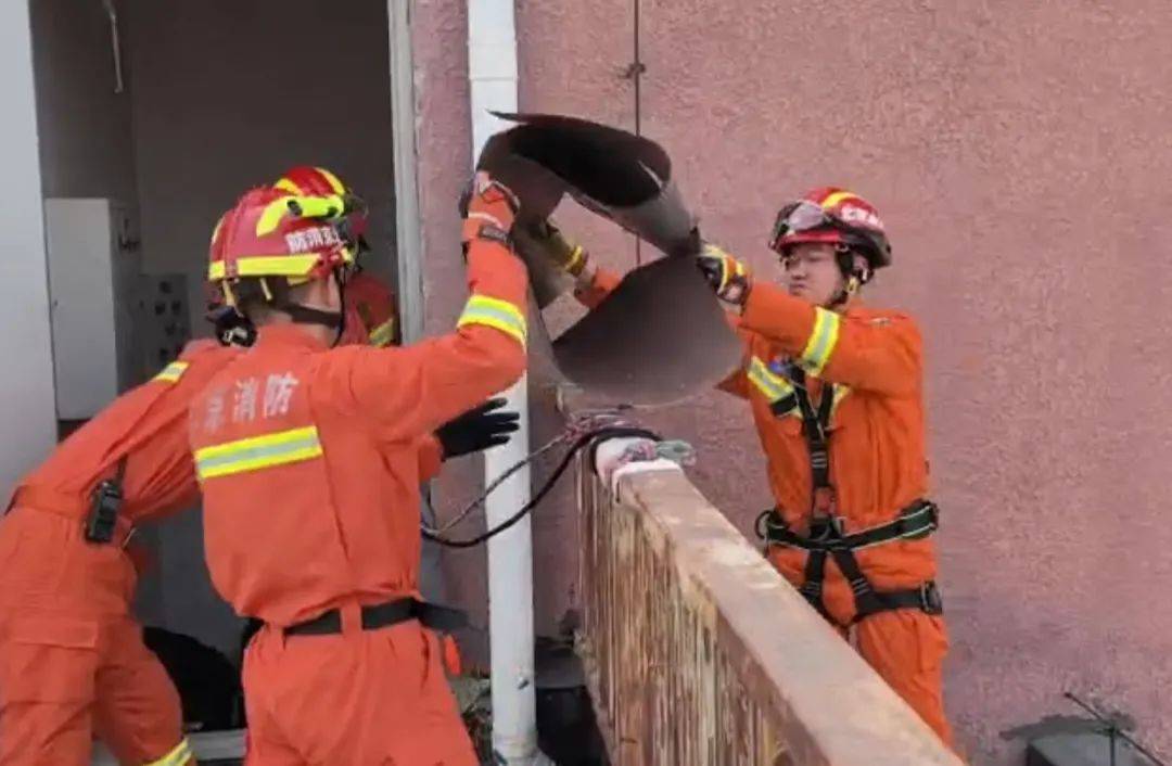 经过对现场情况分析研判,消防救援人员在物业的带领下来到楼顶,由1名消防员在做好防护措施后,趴在楼顶阳台上方,用绳子将铁皮一端绑紧后,绳子交于后方队员手中进行固定,防止在处置期间发生掉落。随后,这名消防员逐一对铁皮进行收卷,最终将铁皮取下。