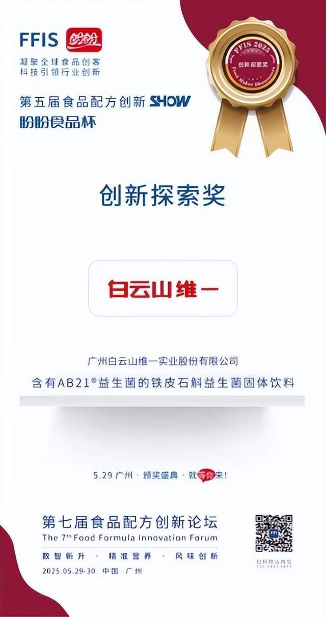 在健康食品行业蓬勃发展的浪潮中,创新始终是推动行业前行的核心力量。日前,FFI2025 第七届食品配方创新论坛在行业瞩目中圆满落幕。这场汇聚健康食品领域精英的盛会,以功能食品未来趋势为核心议题,聚焦功能食品创新发展趋势。作为受邀企业,广州白云山维一实业股份有限公司(以下简称:白云山维一公司)携明星产品——铁皮石斛益生菌固体饮料亮相盛典,凭借 “传统药食同源 + 现代益生菌技术”的创新融合,经专家评审与消费者票选双重认证,斩获 “2025 年度创新探索奖”,成为全场焦点。
