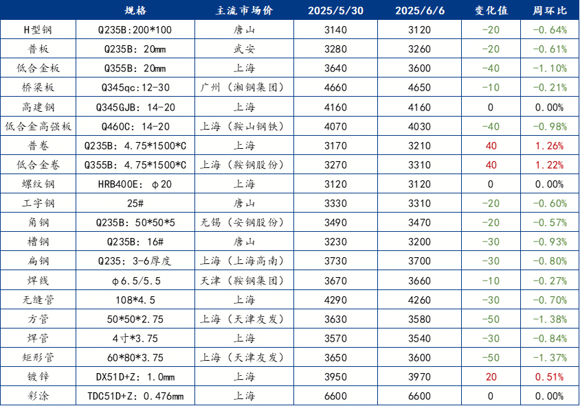 上周全国型钢价格趋弱运行,市场情绪不稳,商家降价销售,下游终端观望情绪较浓,询价和计划较少。目前,型钢厂厂内库存仍处于高位,钢厂仍以去库为主要基调。近期市场终端需求增量也不明显,对后期持续看涨的行情认可度不高,观望情绪较浓。整体来看全国主流城市工角槽全国均价环比下跌18元/吨,H型钢全国均价环比下跌20元/吨。