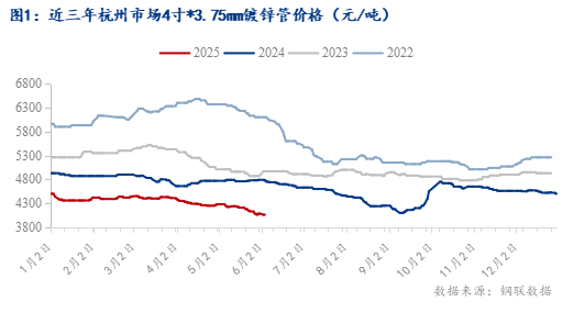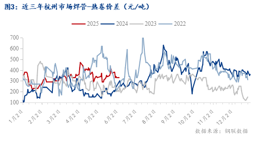 以杭州市场4寸*3.75衡水华岐焊管、镀锌管价格为参考,截至6月10日,两者报价分别为3540元/吨、3950元/吨,价差为510元/吨,处于近三年历史低位,仅与2024年8月14日焊镀价差510/吨持平。从这一角度看,焊镀价差进一步收窄的空间极为有限;这一情况下,镀锌管价格下跌空间或与焊管相似。