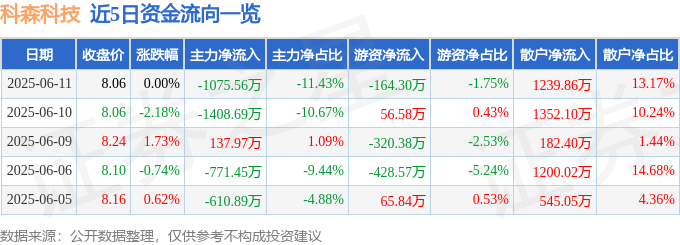 6月11日的资金流向数据方面,主力资金净流出1075.56万元,占总成交额11.43%,游资资金净流出164.3万元,占总成交额1.75%,散户资金净流入1239.86万元,占总成交额13.17%。