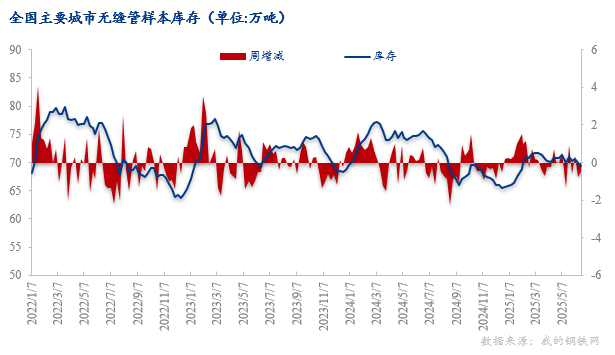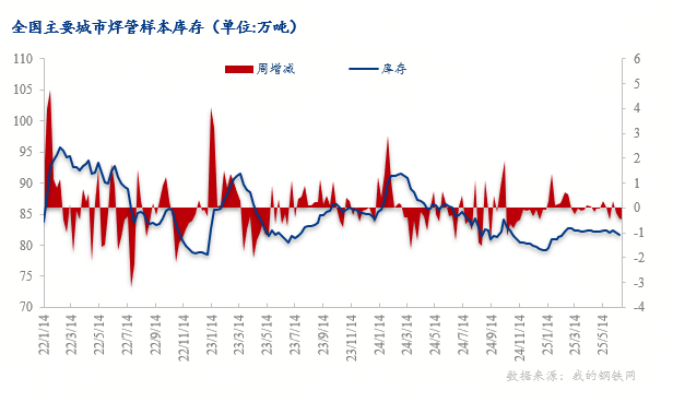 本周钢管市场样本库存焊管降0.48万吨,无缝管降0.52万吨。28个主要城市无缝管样本库存69.35万吨,周环比降0.52万吨,月环比降1.55万吨,年同比降6.32万吨; 28个主要城市焊管样本库存81.16万吨,周环比降0.48万吨,月环比降0.83万吨,年同比降3.55万吨。