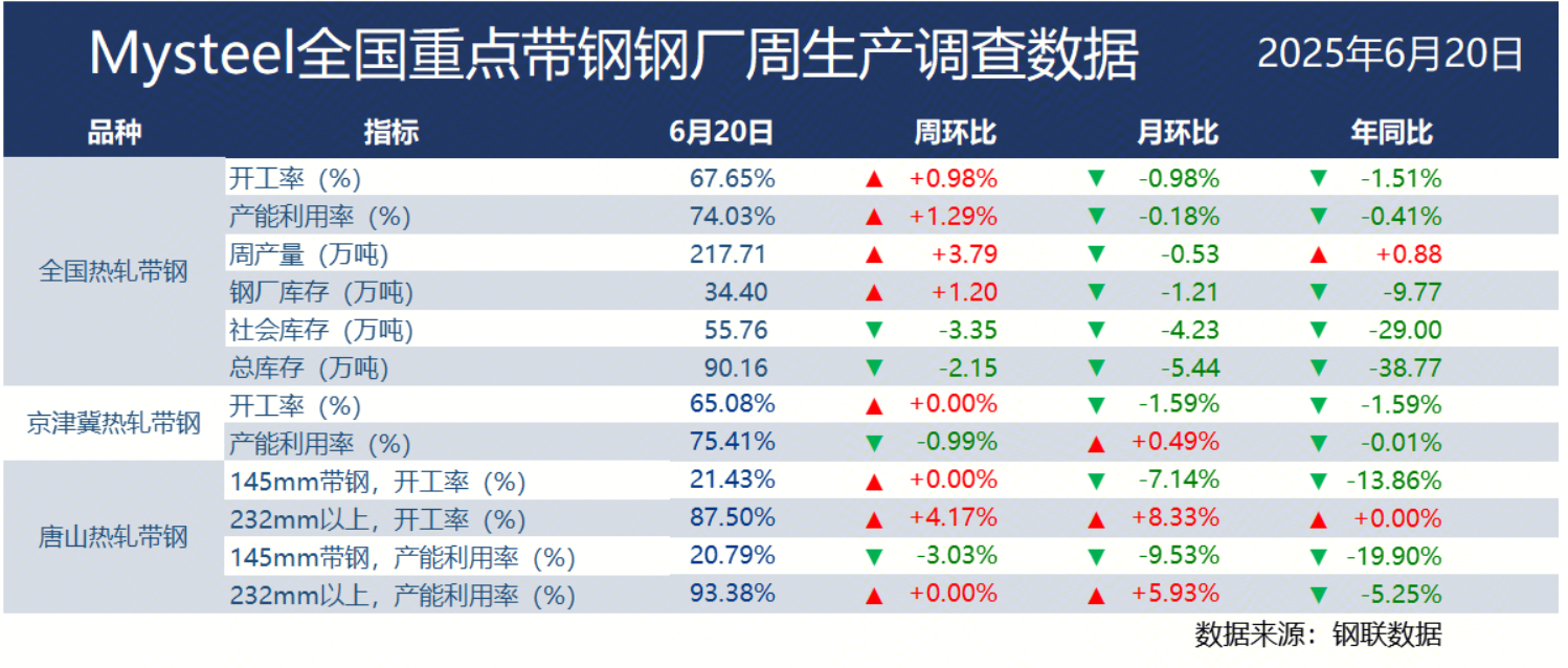截止6月20日,Mysteel调研全国重点热轧带钢生产企业本周开工率67.65%,周环比上升0.98个百分点;月环比下降0.98个百分点;产能利用率为74.03%,周环比上升1.29个百分点;月环比下降0.18个百分点;本周钢厂实际产量为217.71万吨,周环比增加3.79万吨;月环比减少0.53万吨;钢厂厂内库存为34.40万吨,周环比增加1.20万吨;月环比减少1.21万吨。