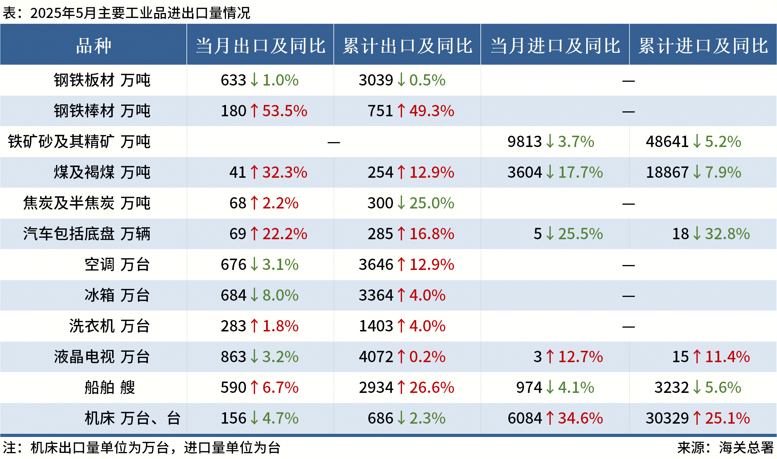 海关总署最新数据揭示,2025年5月我国钢铁板材出口量为633万吨,同比下降1.0%;1-5月累计出口3039万吨,同比下滑0.5%。与之形成鲜明对比的是,棒材出口表现强劲,5月出口量达180万吨,同比增长53.5%,1-5月累计出口751万吨,同比增幅高达49.3%。其他主要工业品进出口情况如下: