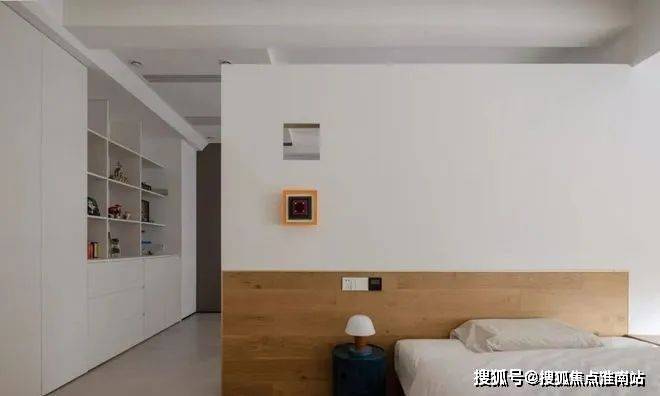 一排顶天立地柜从睡眠区延伸至书房,利用封闭柜与开放格,整合卧室与书房的储物。