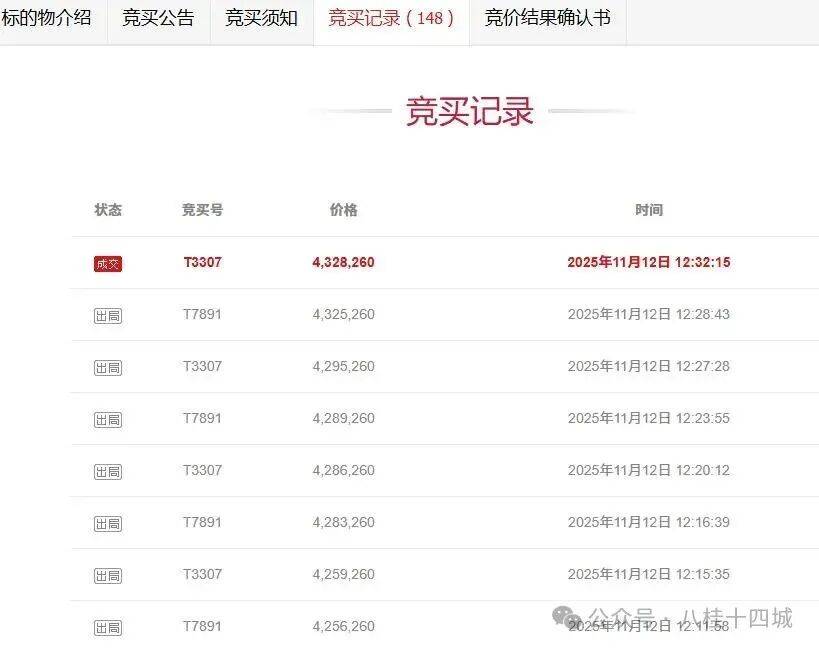 可能是房子商业价值非常高,所以房子评估价是高达412万元。而此次拍卖的起拍价只有288.526万元,比评估价少了一百多万。可能也是起拍价偏低的原因,拍卖开始后,吸引了多达8人报名竞拍。竞拍过程也是相当激烈,原本上午十点结束的拍卖,最后延时竞拍到了12点50分才结束,8个竞拍者一共出价了148次,最终房子以432.826万元成交,成交价比起拍价高出了144.3万元。