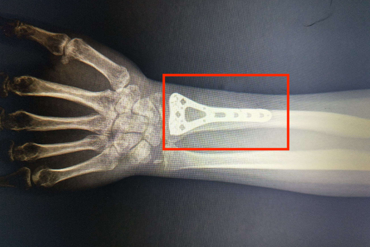 手腕桡骨骨折后,如果检查发现是开放骨折、多段骨折,以及复位失败、固定困难时,应切开进行复位,使用钢板、加压钢板等物质进行内固定。手术后,通过影像学可观察到明显的钢板内置形态。