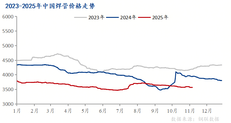 回顾2025年焊管市场,价格整体呈现先抑后扬、再弱势震荡的走势,全年均价水平较2024年进一步下移,但整体跌幅有所收窄。与2024年情况类似,2025年春节后因下游需求释放不佳,市场在“弱现实”压制下持续震荡下行至6月底,下跌时长近4个月,由2月8日(农历初十)3755元/吨跌至6月30日的3473元/吨,跌幅为282元/吨。7月随着原料焦煤价格触底反弹,成本端推动焊管价格结束下行趋势并快速拉涨,从7月1日的3470元/吨涨至8月14日的3720元/吨,涨幅达250元/吨,基本修复上半年跌幅。随后焦煤价格见顶回落盘整,焊管行情再度进入弱势震荡阶段。9-10月宏观面虽对市场形成一定托底,但由于后续政策未超预期,加之终端下游资金到位情况仍不理想,“旺季不旺”特征凸显,市场竞争加剧导致焊管价格继续上行阻力较大。经历近两年的深度调整后,行业心态普遍趋于谨慎,2025年无论管厂库存还是社会库存均保持相对平稳,焊管整体需求降幅亦有所收窄,因此全年供需矛盾并不突出,价格走势高度跟随原料成本波动。从全年来看,2025年焊管均价处于历史价格区间的中位线下沿 。