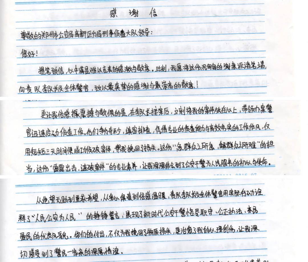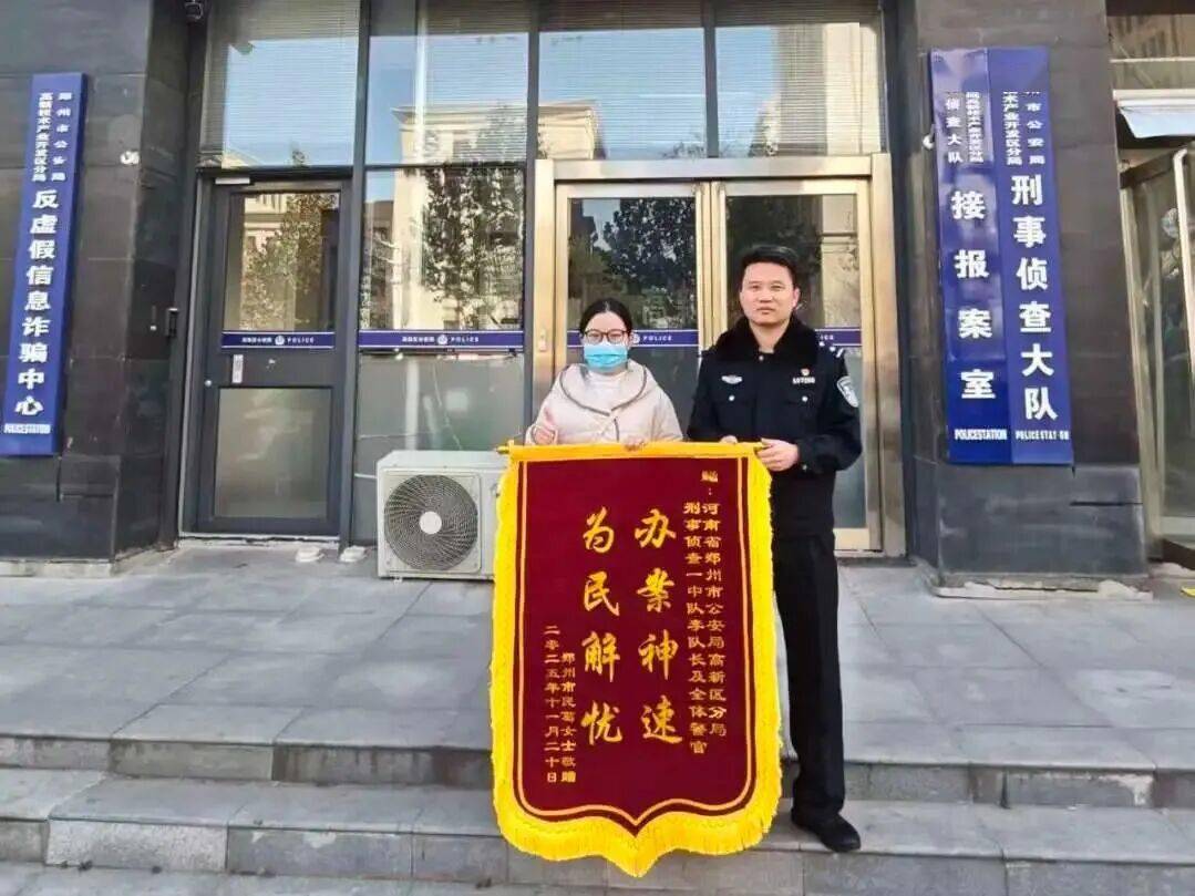 近日,郑州高新分局刑侦大队面对一起精心设计的诈骗案件,奋力追踪资金流向,辗转多省全力追捕嫌疑人。经过不懈努力,最终为受害人葛女士全额追回被骗款项。之后,葛女士送来锦旗与感谢信,锦旗上“办案神速,为民解忧”八个大字,正是对民警全力守护群众财产安全的最佳注脚。