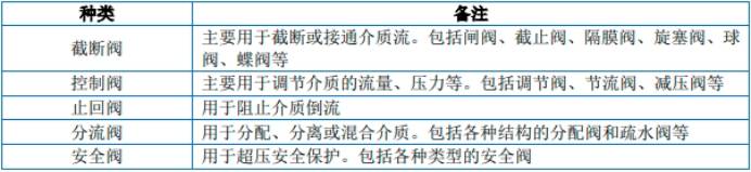(1)气瓶阀门产品的特性和分类:阀门是流体输送系统中的控制部件,具有截止、调节、导流、防止逆流、稳压、分流或溢流泄压等功能。用于流体控制系统的阀门,从最简单的截止阀到极为复杂的自控系统中所用的各种阀门,其品种和规格相当繁多。阀门可用于控制空气、水、蒸汽、各种腐蚀性介质、泥浆、油品、液态金属和放射性介质等各种类型流体的流动,根据使用场景的不同,阀门可分为水暖阀门、工业阀门、医疗阀门等,而根据用途的不同,阀门分类如下: