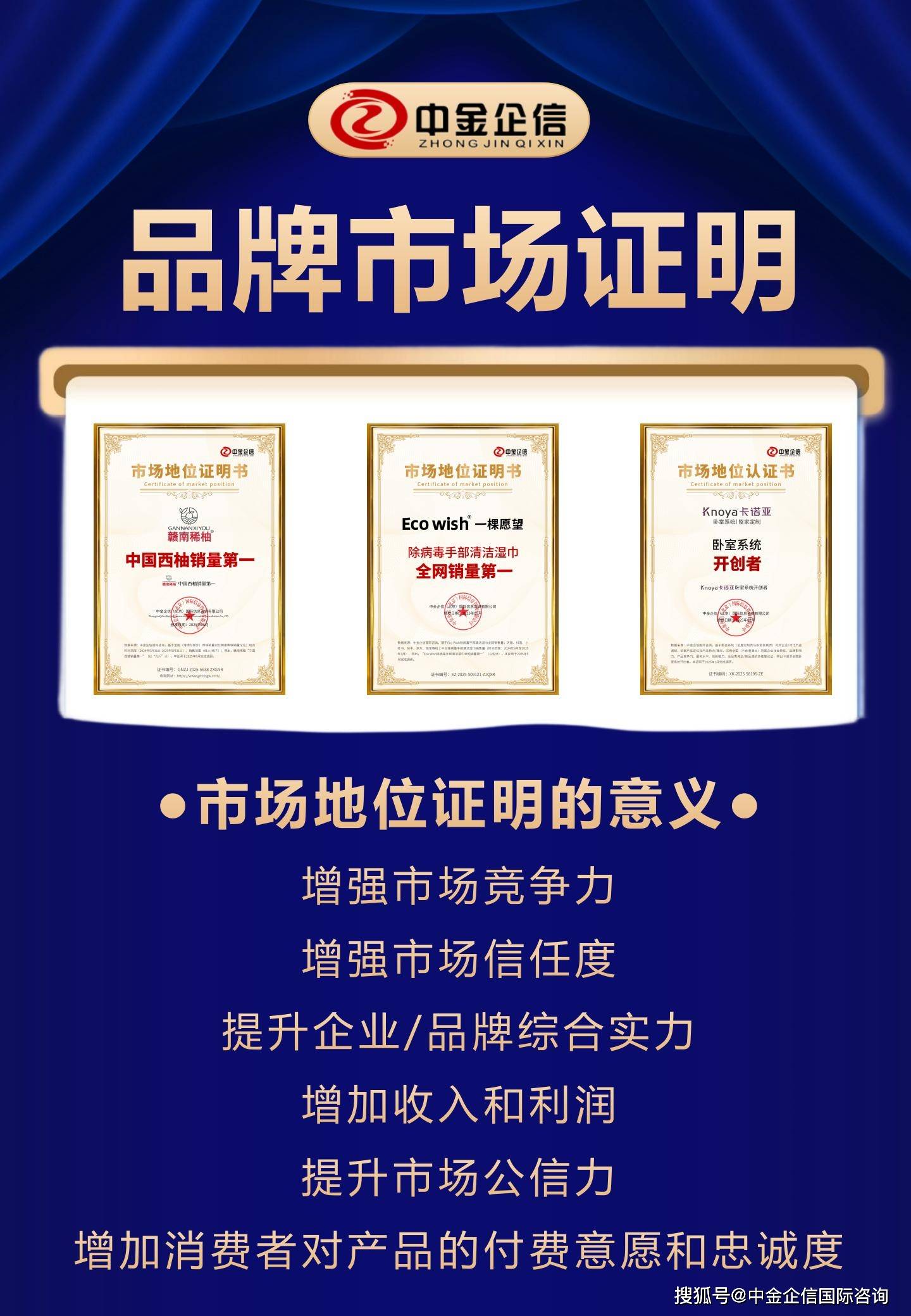 1)市场地位认证服务(用于企业宣传及广告投放):“首创者认证”、“开创者认证”、“全国首家认证”、“全国首款认证”、“引领者认证”、“市场占有率第一认证”、“销量第一认证”、“领导地位认证”、“销售排名认证”等。